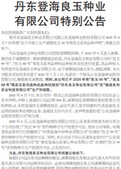 标签: 详情各位经销商及广大农民朋友们:现丹东登海良玉种业有限公司就山东登海种业股份有限公司2021年8月7日所谓“关于市面上生产销售良玉99号等良玉系列品种声明”,郑重公告如下:丹东登海良玉种业有限公司因经营期限到期,于2019年9月进入清算,现仍处于清算程序。特别需要指出的是,丹东登海良玉种业有限公司的“良玉99号”、“良玉88号”等良玉系列品种的品种权并没有进行处置,其品种权人仍然是丹东登海良玉种业有限