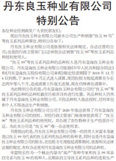 标签: 详情各位种业经销商及广大农民朋友们:现由丹东良玉种业有限公司就本公司生产和销售“良玉99号”等良玉系列品种事宜,特别公告如下:丹东良玉种业有限公司是依据相关法律规定,合法注册的公司;也是经行政主管部门以法审批合法销售“良玉99”等良玉系列品种授权使用人。“良玉99”等良玉系列品种的品种权人是丹东登海良玉种业有限公司。丹东登海良玉种业有限公司依据《中华人民共和国合同法》和《丹东登海良玉股份有限公司章程》